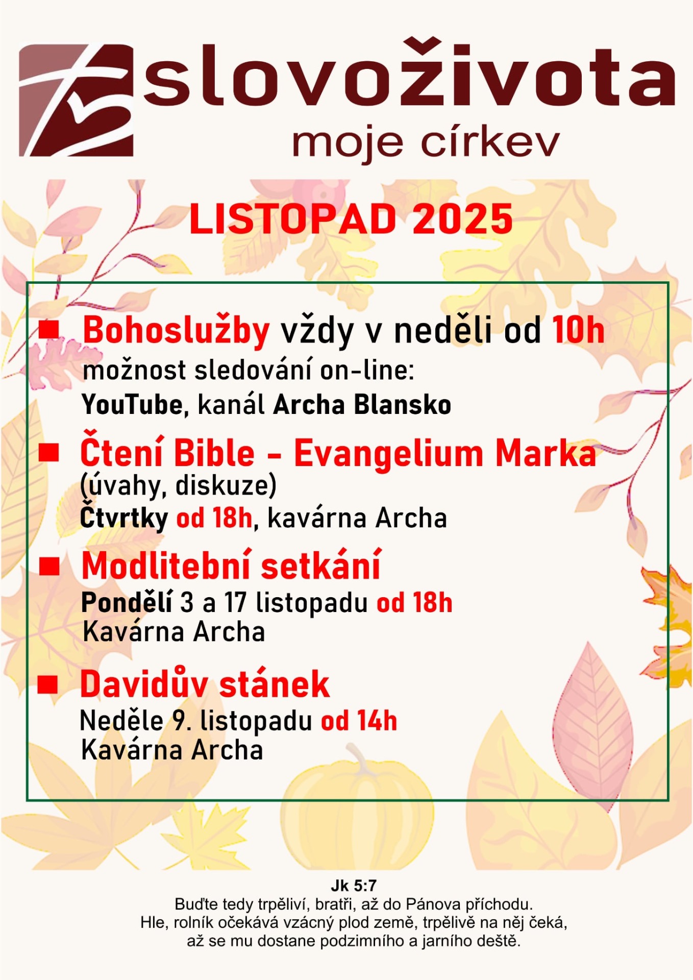 Společné studium Bible, zamýšlení se nad Božím slovem, diskuze a modlitby. Čteme knihu Marek. (30.10., 6.11., 13.11., 20.11., 27.11.)