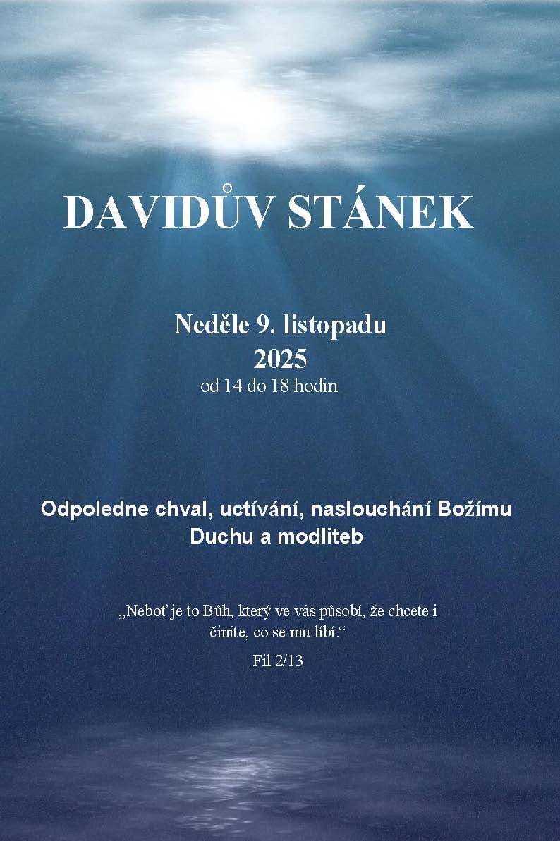 Zveme Vás na odpoledne chval, modliteb a uctívání na Davidově stánku. Bude se konat v neděli 9. listopadu od 14:00 do 18:00 v kavárně Archa.
